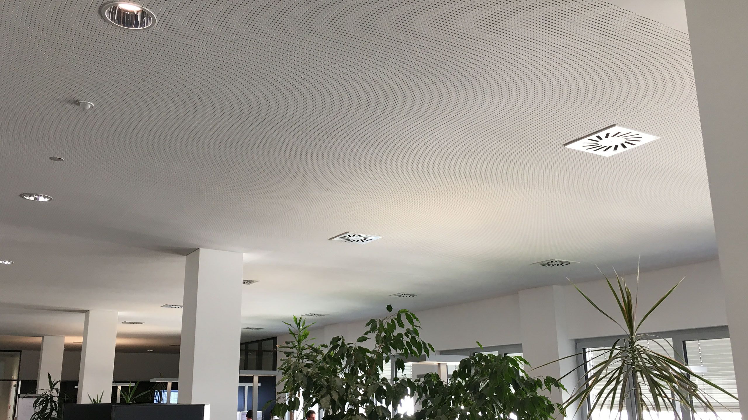 Die Integration von Licht-, Brandschutz- und Ab- sowie Zuluftelementen schafft hier eine optimale Kombination zur Raumakustik.